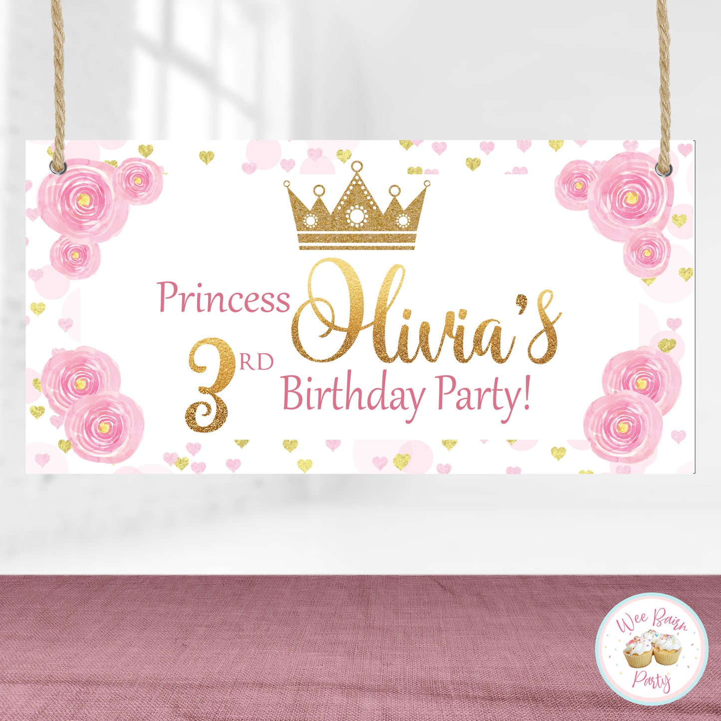 Make your party royally special with this princess birthday banner! Print at a local copy/print shop and hang for a perfect party decoration!